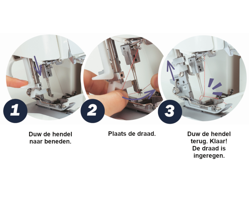 Snel en eenvoudig de naald inrijgen! Met de automatische naaldinrijger wordt de naald in 3 eenvoudige stappen ingeregen.
